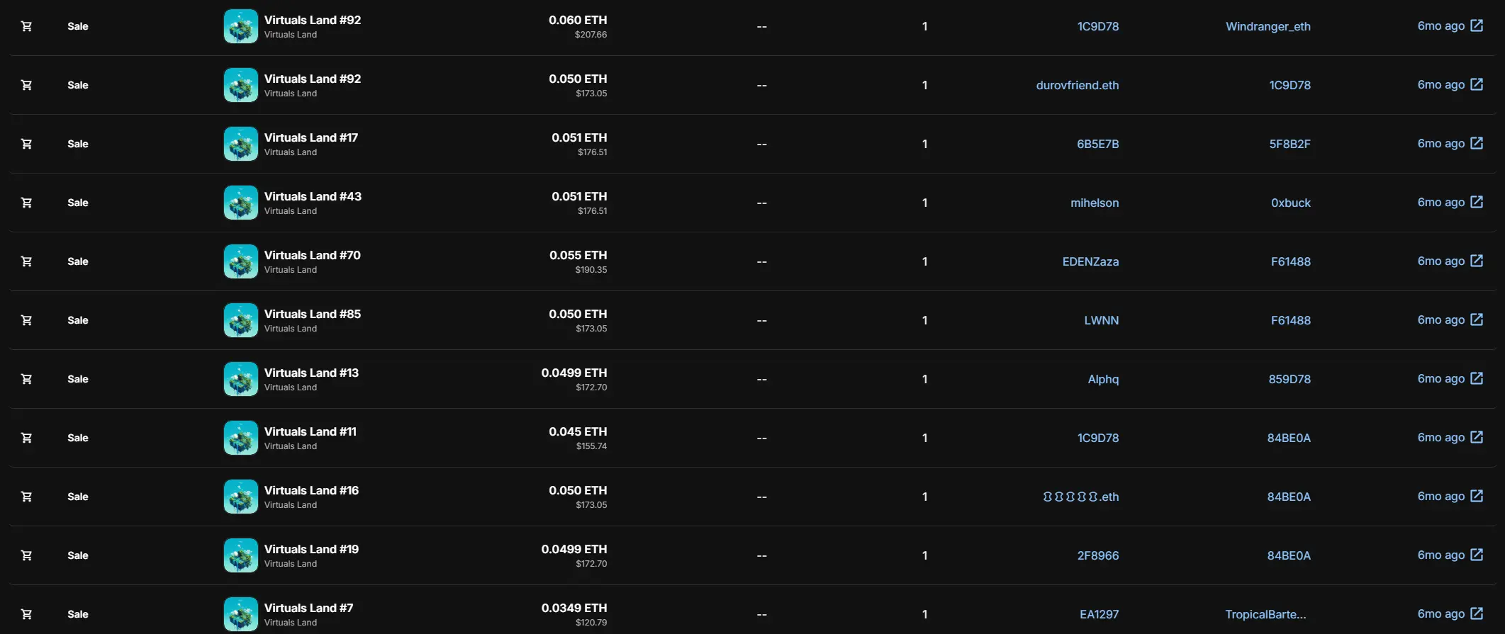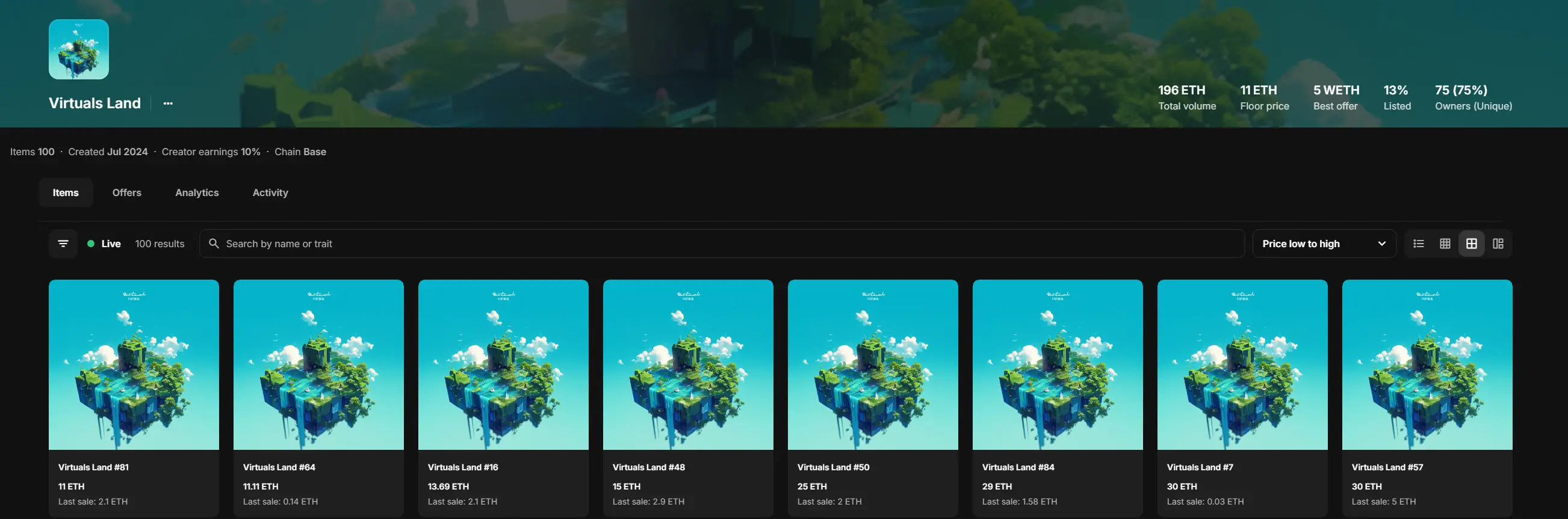 这是 Virtuals 官方在 2024 年 7 月的时候发行的一个 Free Mint 土地系列,总量只有 100 个,没有什么白单之类的限制。尽管如此,在当时,甚至打了接近 20 分钟才打完,你甚至曾经有以这么低的价格买入的机会: