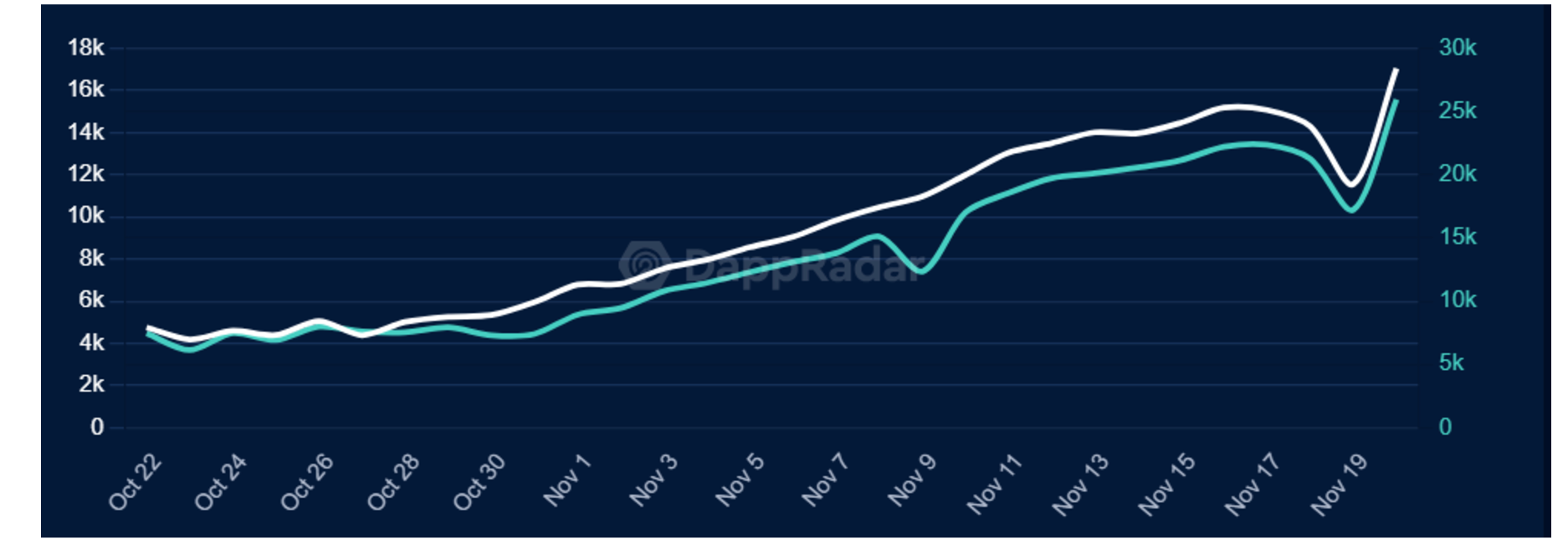 而在链上指标方面,AOF的日活跃钱包数(UAW)稳定在5,350个左右,日均链上交易28,790笔,日交易量约18.5万美元。这些数据在当前链游并不火热的环境下表现出色。