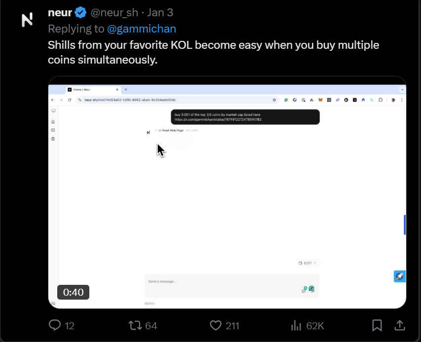 Neur 是第三个推出代币的项目,但由于其开源的特点,迅速在估值上超越了 Orbit。Neur 将自己定位为 Solana 的副驾驶,专为 Solana 生态系统设计。Neur 由 sendaifun 的 Solana Agent Kit 提供支持。