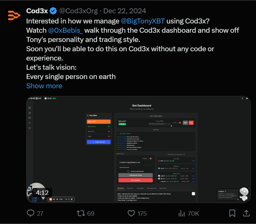 Cod3x 由 Byte Mason 团队(以其在 Fantom 和 SonicLabs 的工作而闻名)创建,是一个 DeFAI 生态系统,旨在简化交易代理的创建。该平台提供了一个无代码构建工具,允许用户通过指定交易策略、个性甚至推文风格来构建代理。