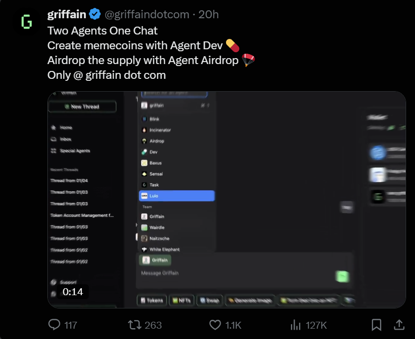 Griffain 更加通用,允许用户执行从简单到复杂的各种操作,如任务自动化(DCA)、发布 memecoin 和进行空投等。