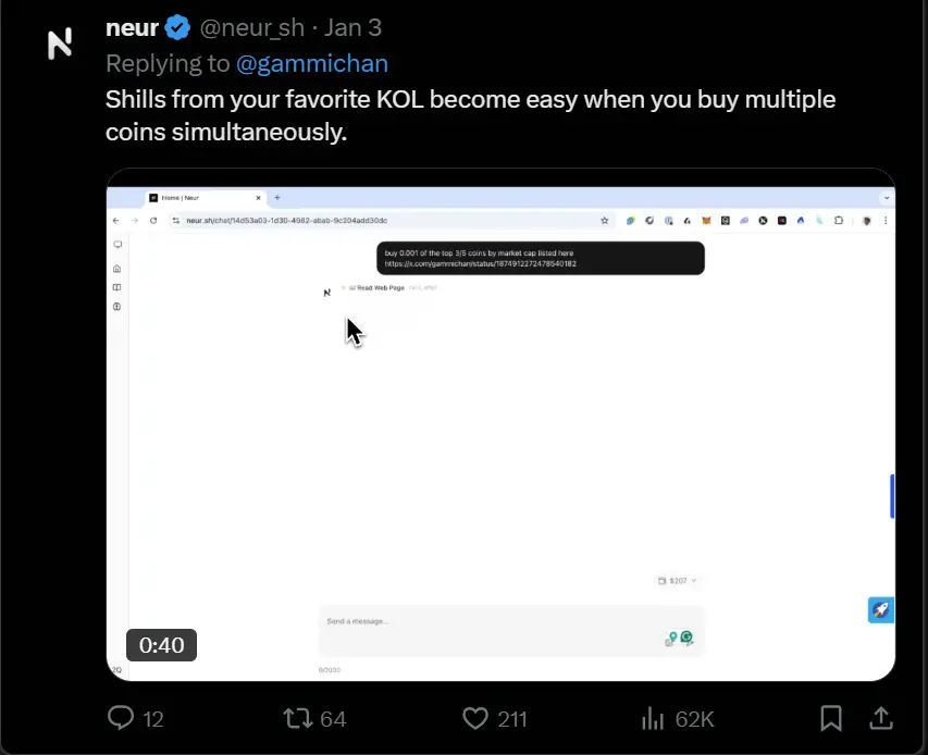 Neur 是第三个推出代币的项目,但由于其开源的特点,迅速在估值上超越了 Orbit。Neur 将自己定位为 Solana 的副驾驶,专为 Solana 生态系统设计。Neur 由 sendaifun 的 Solana Agent Kit 提供支持。