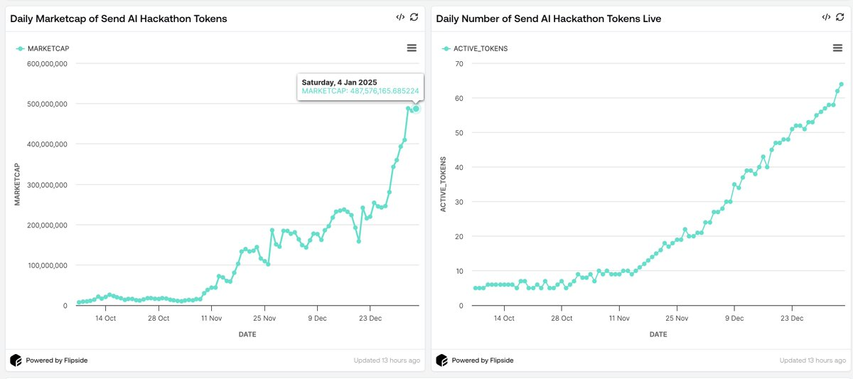 但我们没想到的是,这次黑客松竟然变成了投机者的天堂(可以参考这里的数据)。仅一周时间就吸引了超过 4 万名访客。现在,每天都有 2-3 个黑客松项目推出价值 5000 万美元的代币,总市值已经超过了 5 亿美元。无意间,Solana AI Hackathon 已经成了一个 AI 代币的发现平台。