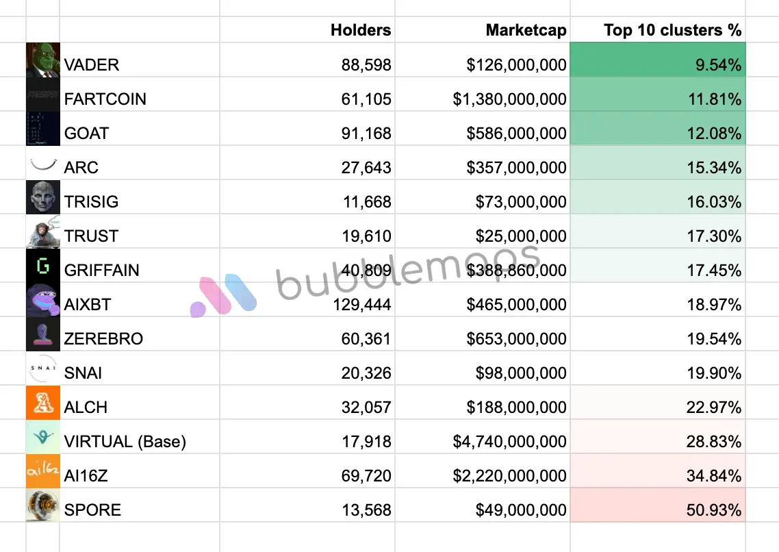 在这份名单中,$VADER 是前 10 个集群持有比例最低的 Token,仅为 10%。
