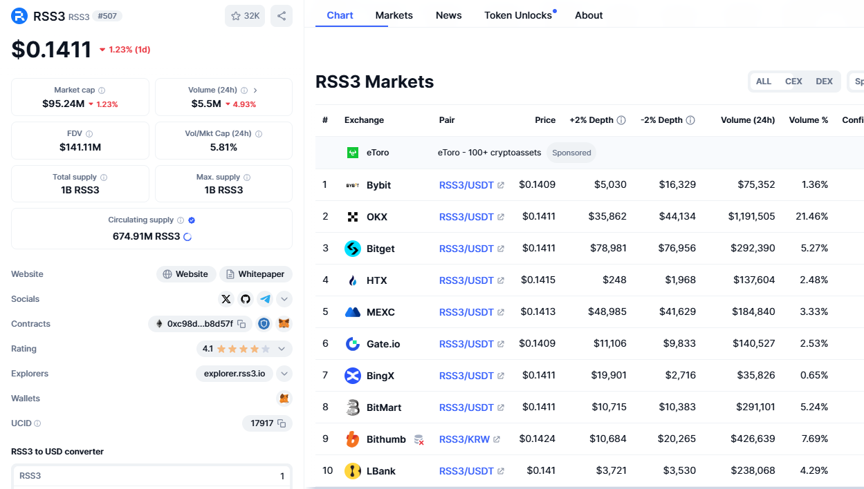 根据 coinmarketcap 的代币信息,RSS3 目前已经上线了 OKX,Bybit,Bitget,HTX,MEXC,Gate 以及韩国交易平台 Bithumb 等交易平台!并传言或将上线 coinbase 交易平台!