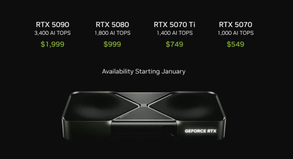 接下来是性能对比。大家熟悉的 RTX 4090,售价 $1599,是家用 PC 娱乐中心的核心投资。而现在,RTX 50 系列提供更高性能的同时,起价仅为 $549,从 RTX 5070 到 RTX 5090,性能是 RTX 4090 的两倍。