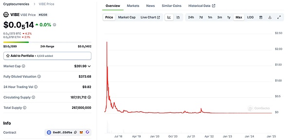 VIBE的价格曾从0.04美元飙升至超过2美元,但最终其总市值却跌到了仅262美元。