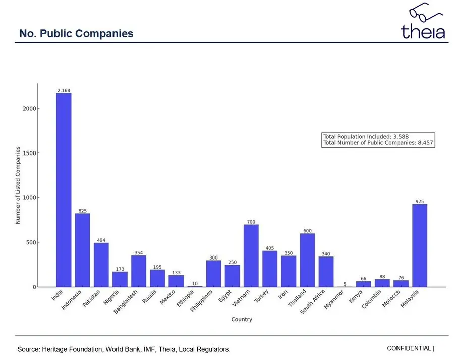 现有的金融系统并不允许小型公司进入全球资本市场。这意味着较小的公司需要支付更多的资本成本和向中介支付的租金。按人口计,全球 20 大新兴市场包括 35 亿人和 8457 家上市公司。你无法将它们连接起来,比如墨西哥有 1.28 亿人口,但仅有 133 家公司上市。这是远远不够的。