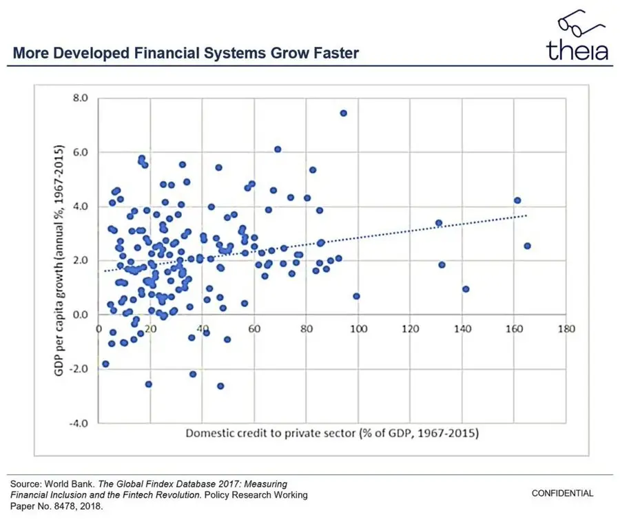 约瑟夫·熊彼特曾指出,更为复杂的金融系统能够促进更快的经济发展,自他提出这一观点近 100 年来,无数经济学论文通过实证数据验证了他的论断。具体的估算虽然有所不同,但金融系统深度的加倍,通常能在多年的时间里带来 50 到 100 个基点的年经济增长。