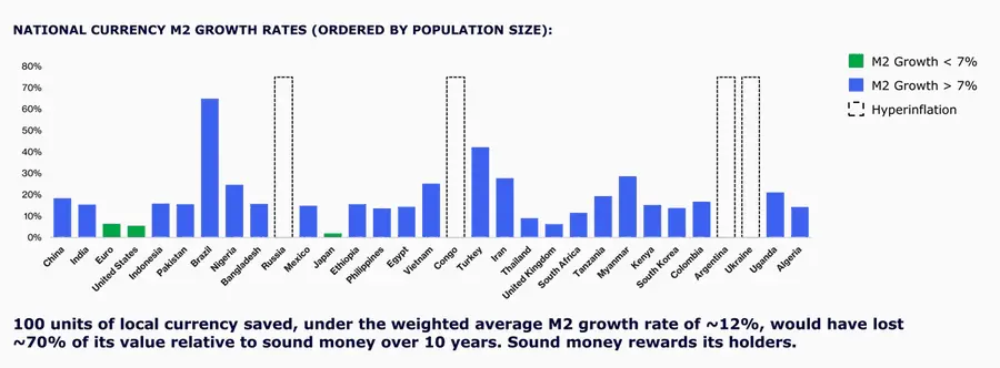 全球 20 大新兴市场的总人口超过 50 亿,且其平均的遗产基金会产权评分低于 43。弱化的产权保障问题与任意的货币供应增长相互交织。全球超过 80% 的人口生活在高通胀环境中——这被定义为过去 30 年中,年货币供应量增长超过 12%。大多数人由于本地银行系统和支付渠道的限制,被迫持有本国货币。