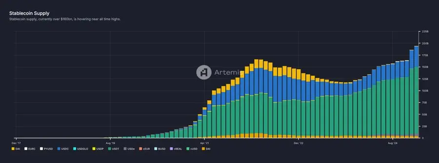 稳定币为这些人提供了一个机会——可以直接在互联网金融系统中持有美元,而不需要依赖当地银行系统。在短短五年内,稳定币的总量已经增长到了 2000 亿美元。