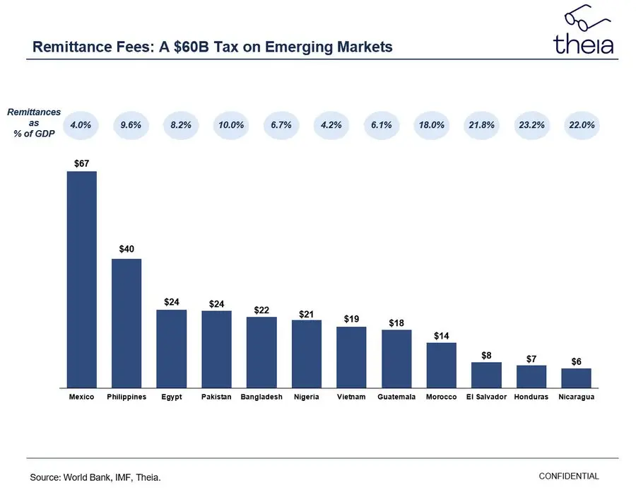 我们现有的金融系统,基于有权限的孤立服务器,无法实现资本的自由跨境流动。每个地方银行寡头都利用其对汇款接收者的特权地位——控制本地服务器和进出通道——来榨取租金。以汇款为例,这一动态很容易理解,因为我们直观地知道,一个勤劳的移民不应当支付 7% 的费用将钱汇给母亲。到 2025 年,汇款的成本应当低于 0.01 美元。