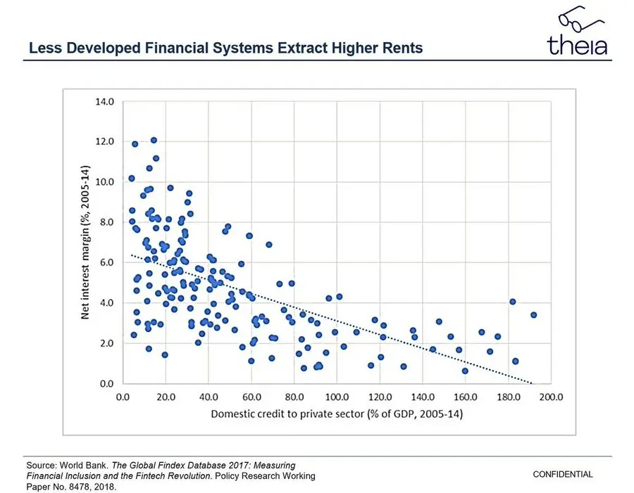 对于我们大多数人来说,观察全球金融系统各个领域中的同样的榨取过程更为困难,因为这些成本是更加抽象的一层。然而,我们可以通过观察净利差(NIM)来近似估算地方银行寡头的真实成本——即金融机构借款成本与其贷款收费之间的差异。在全球范围内,金融体系较不发达的地区,其净利差通常会更高——通常在 5% 到 10% 之间,但这个数字可以更大。