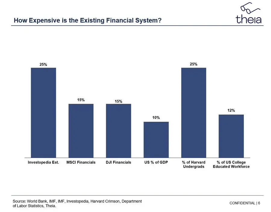 然而,我们确实将大量资源用于维护这个许可式、隔离式的服务器金融系统。仅在美国,就有 850 万金融服务工作者,占全美大学学历劳动者的 12.5% 以上。过去几十年,哈佛大学大约有 20% 到 30% 的本科生进入了金融服务领域。即使是像耶鲁大学这样的顶尖学府,数字也相当接近。