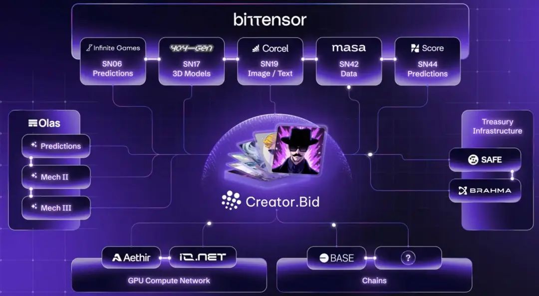 这其中,CreatorBid 必然是绕不过去的一环。它最大的特点在于和 Bittensor 子网与 Olas 集成,为其生态系统带来了显著的实用性,特别是通过 Olas 即将推出的 Mech Marketplace。