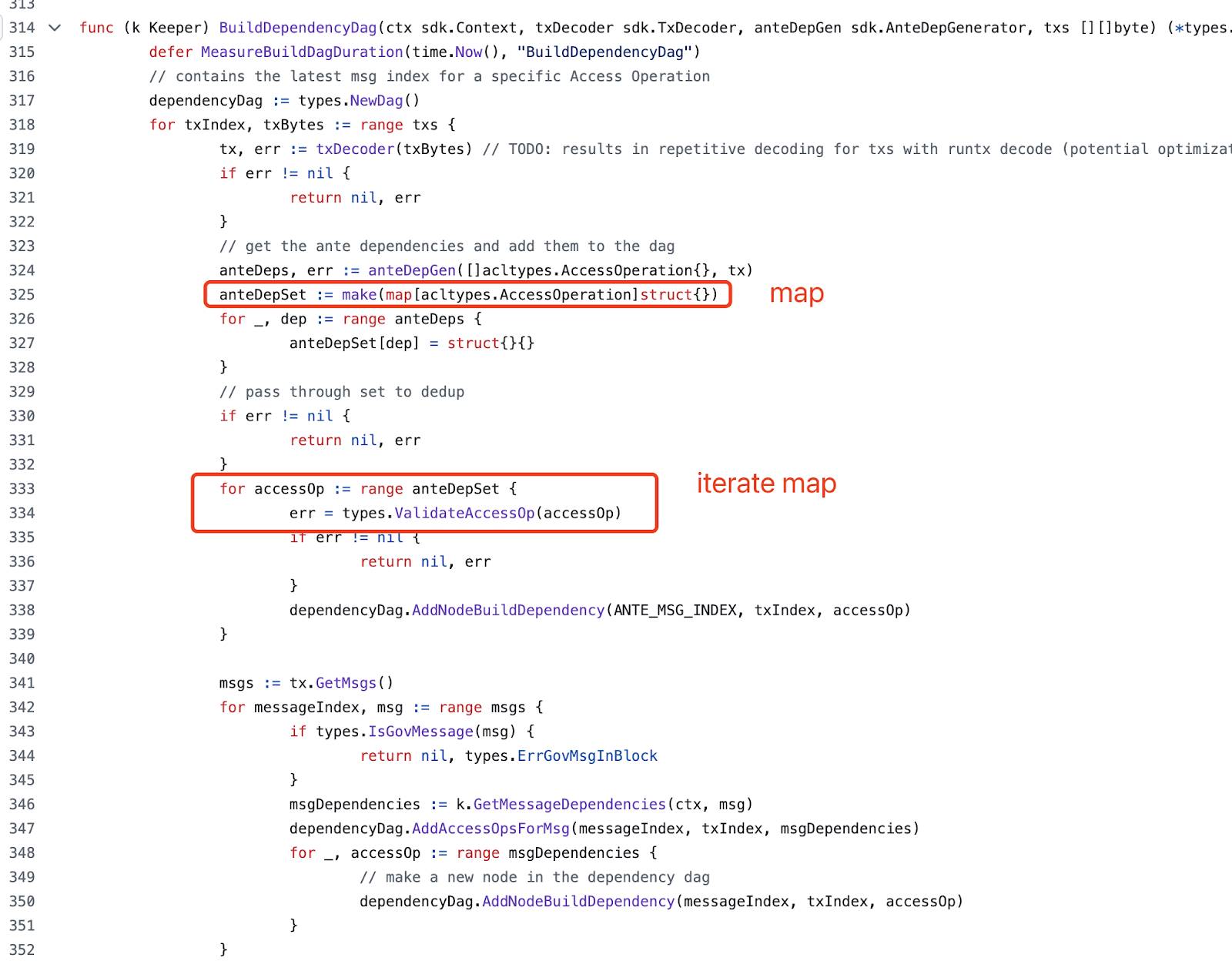 go语言的map的迭代是非确定性的,如果在生成共识的时候,没有考虑到这点,会导致共识问题。示例代码如下: