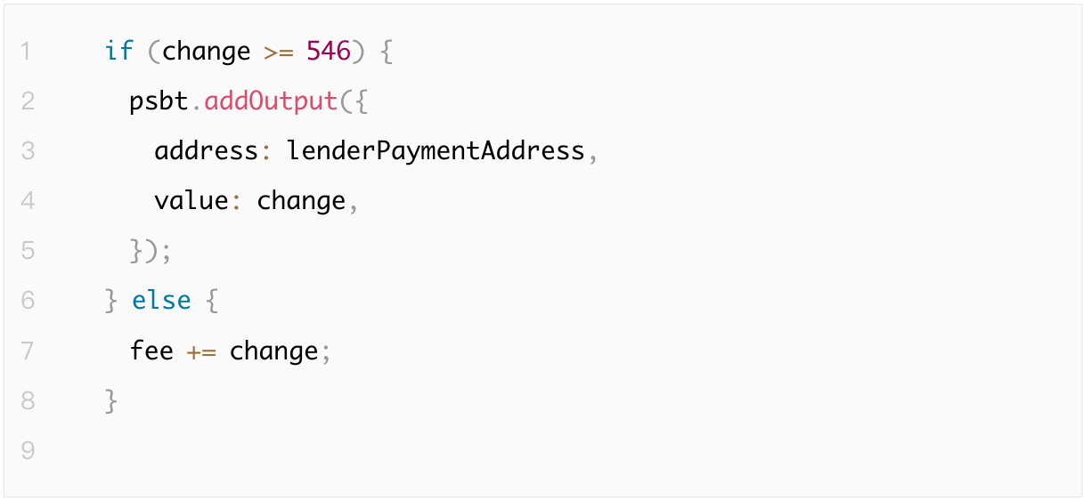 比如在如下代码中,找零输出计算实现包含一个条件:只有当找零金额大于或等于 546 聪时才会添加找零输出。这个值对应于传统 P2PKH 交易的尘埃限制。然而,不同地址类型的尘埃限制有所不同。特别是,对于 Taproot 地址,尘埃限制为 330 聪。