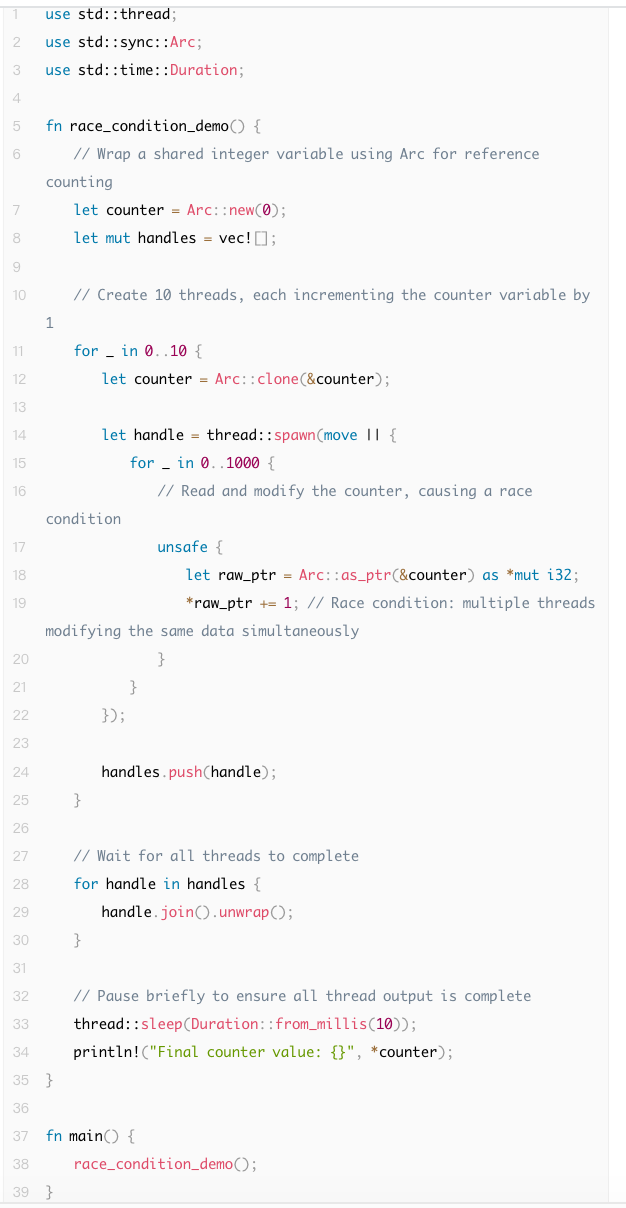 以下是Safe Rust的条件竞争漏洞演示。在这个例子中: