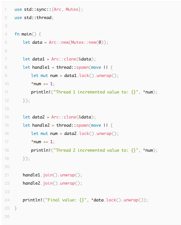 ●因为操作是分步完成的,即使数据受 Mutex 保护,线程 1 和线程 2 的执行顺序会影响最终的打印结果。理论上,最终值应为 2,但具体的线程打印输出顺序可能不固定。