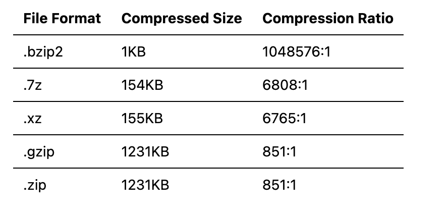 其他的压缩算法也会出现同样的问题。下面是压缩1GB大小的内容全部为0的文件,常见算法的压缩比列表: