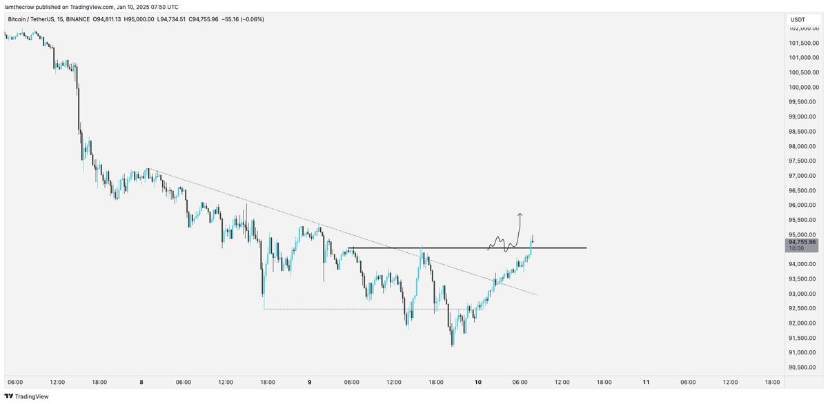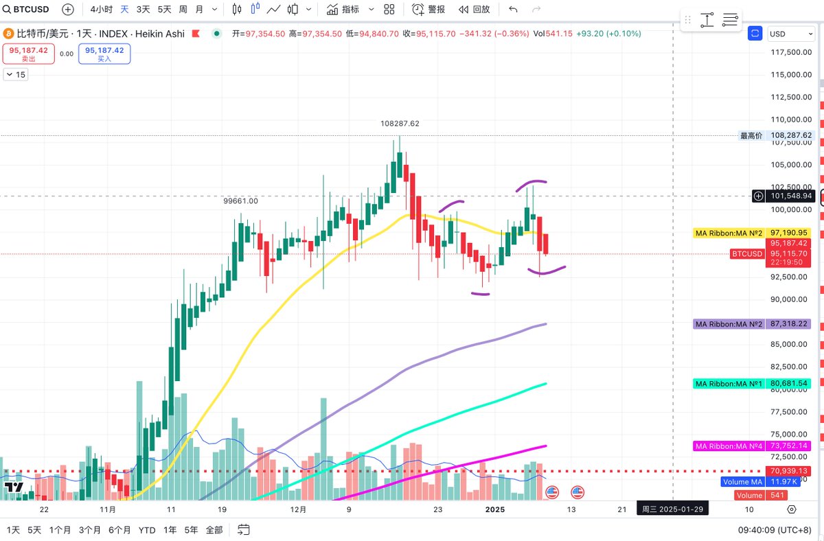 比特币日线级别目前出现一个过于明显的头肩顶 12 月 30 号批准出售丝绸之路的消息,在 94k 放出来,疑似操纵市场的信息,短期底部 92k,看突破 100k 趋势线摸 104k 诱多,然后大崩盘开始。