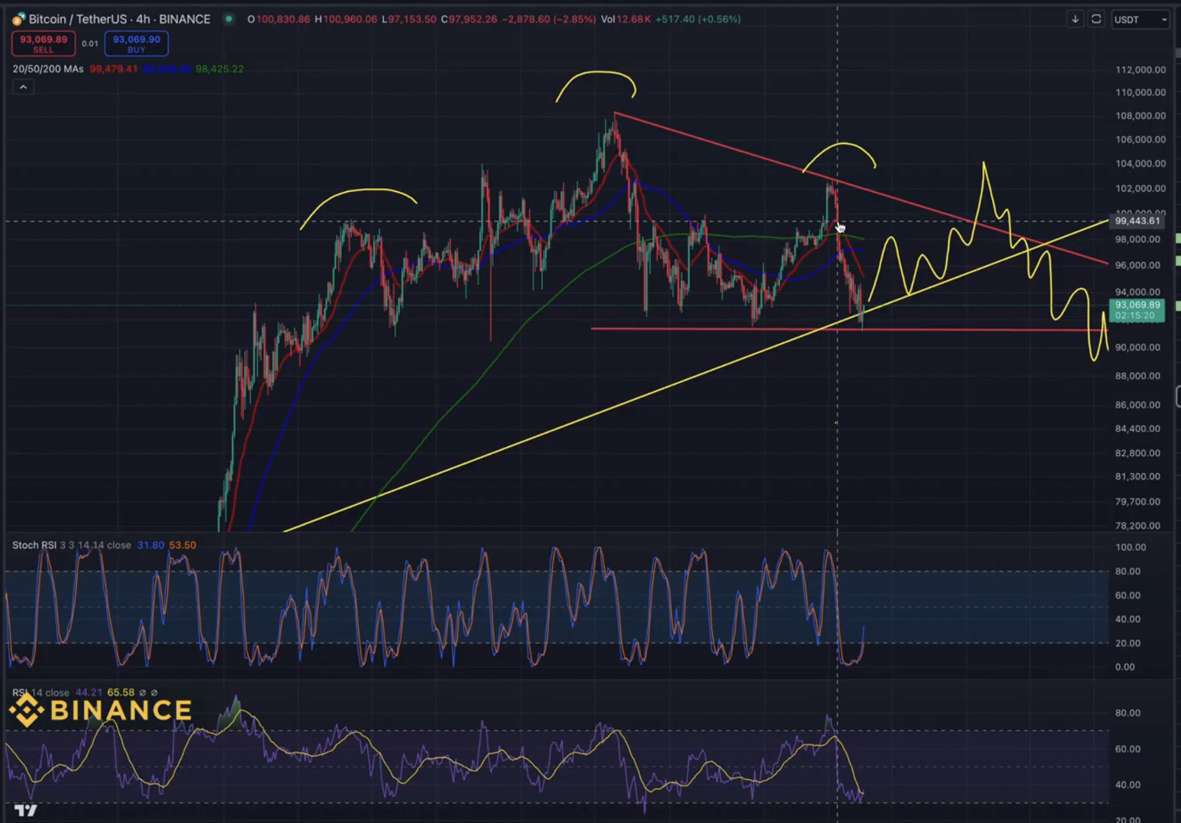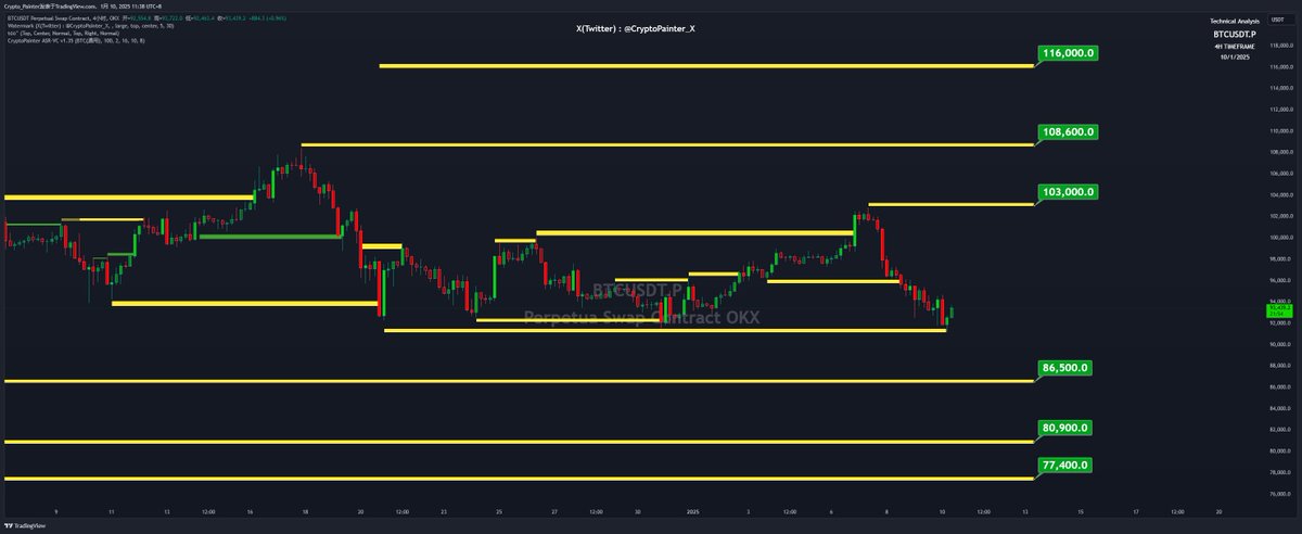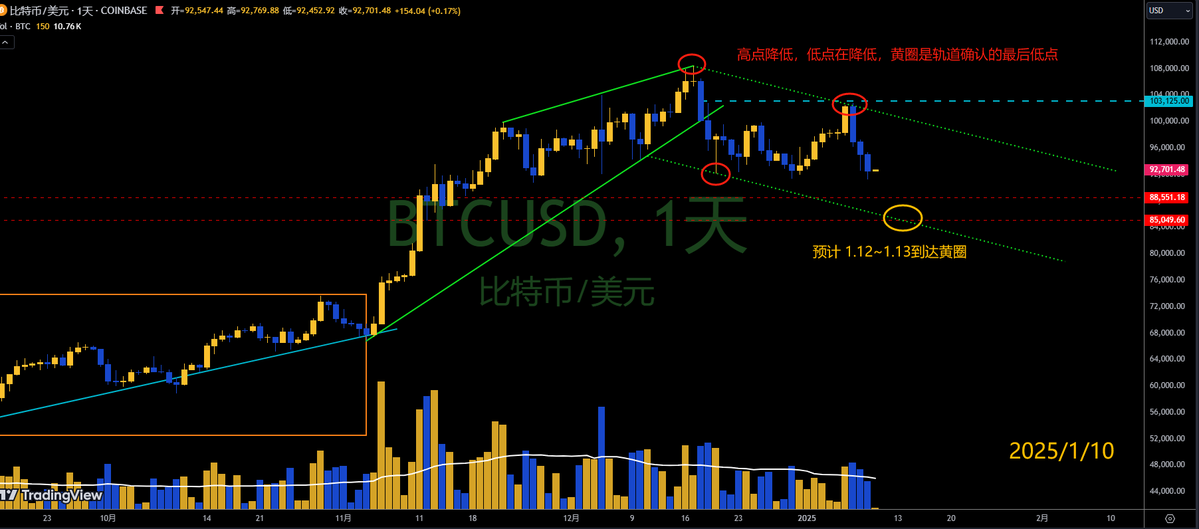 下周大概率出现本次调整的低点,有概率在黄圈位置,到达黄圈后,可能会盘整 14~28 天发起蓄势攻击,预期目标 116500 美金。