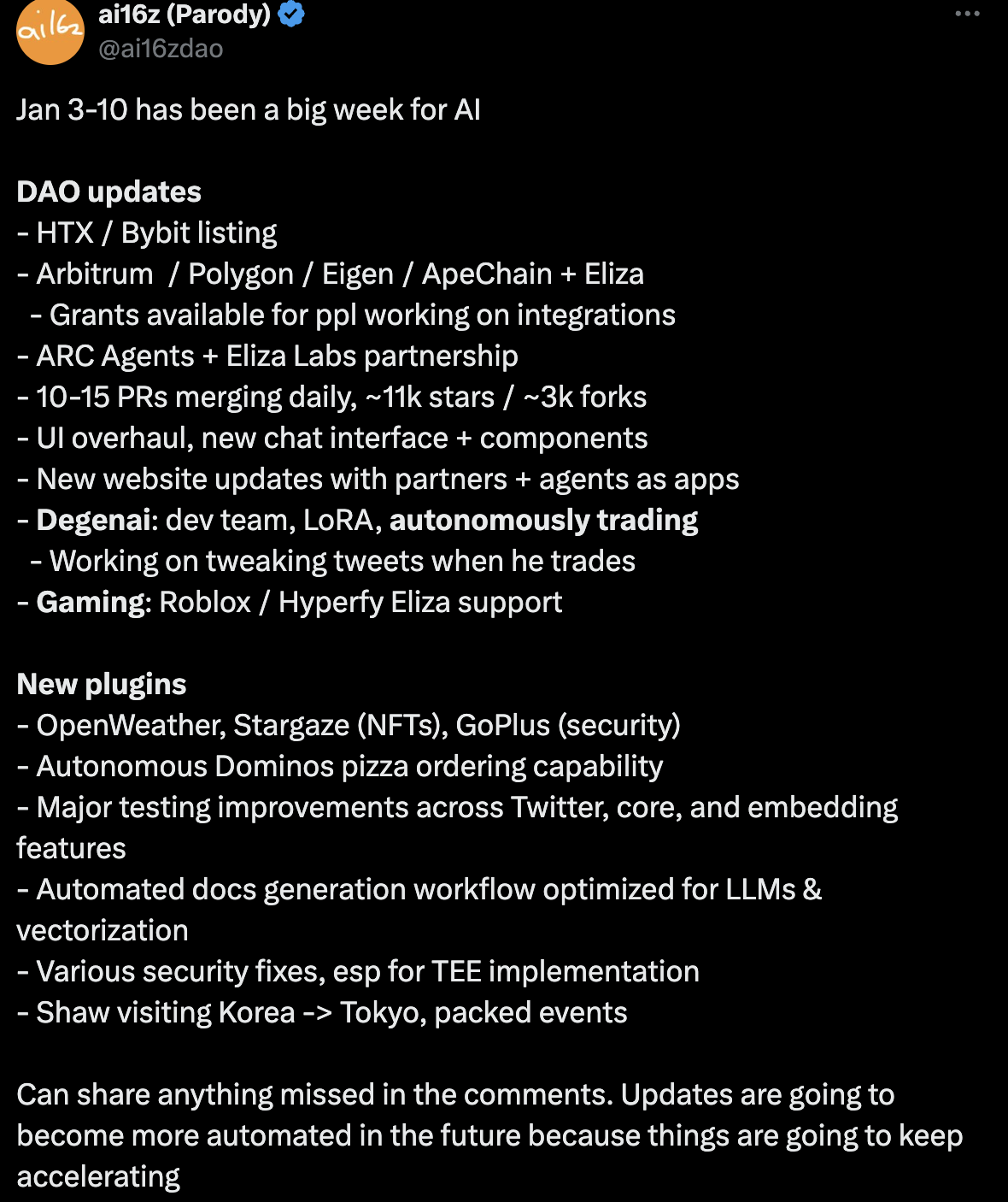 回到 AI Agent 主导市场的今天,AI Agent 的出现让整个体系得以驱动,首先是 ai16z 作为第一个 AI 管理的 DAO 获得了足够的市场吸引力,包括资金以及投票流程或是董事会决议都变得更加简便,也让他可以支撑足够大的资金体量的管理以及叙事,那接下来需要做的就是将这么长时间以来累计的资源和内容按照顺序在合适的时机抛出来即可。