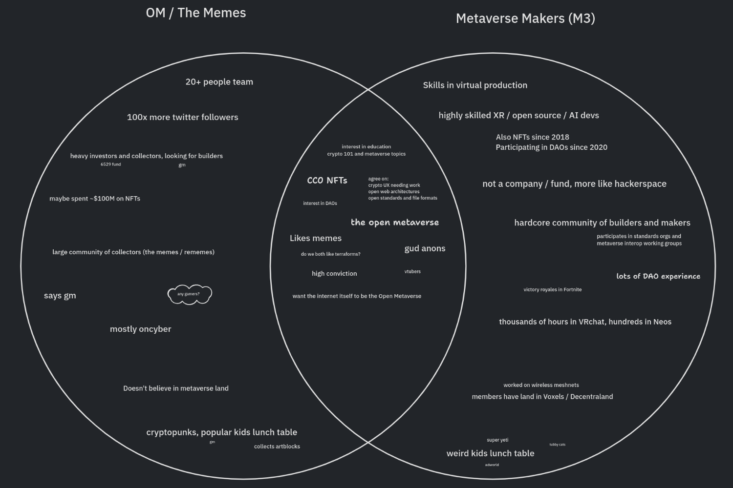 提到 M3org 就必须提到一个神秘人 JIN「@dankvr」。他从未在网络上露面,作为 Shaw 的多年好友与 M3org 的主要贡献者,他投身 VR 和 Crypto 领域已经超过 10 年的建设者,自 2013 年开始参与 VR,自 2017 年开始构建 NFT,自 2019 年以来投身 DAO 做出贡献。JIN 在描述自身的经历时,提到了想要像丝绸之路一样将不同的虚拟世界平台连接在一起,就像将大学和研究实验室连接在一起最终形成互联网一样。而这个愿景与 M3org 的愿景无异,只是许多像 Jin 一样的人聚在一起组成了这个神奇的 DAO,其中可能很多人都是受 Hackers 或者 Matrix 等电影书籍文化影响,一心只想构建 SnowCrash 里描绘的 Metaverse。