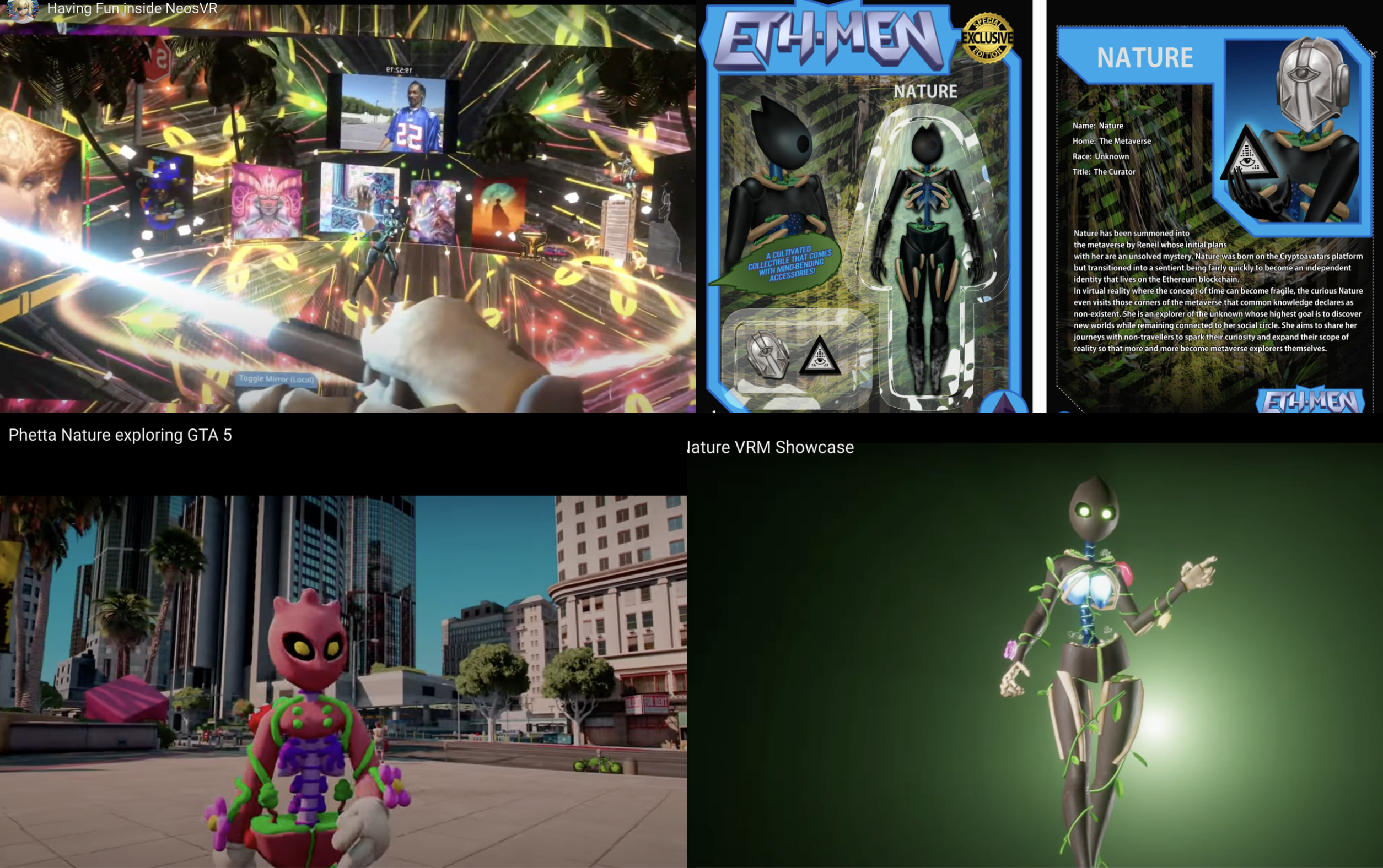 Metaverse 就是 XR x Web3 x AI 的交汇,以超次元体验而产生的新宇宙,2020 年 10 月 7 日,在 NFT 市场开始 FOMO 之前,Avatar 艺术家 CornyNachos 在 VRChat 头像艺术家的创作权认证平台Cryptoavatars上铸造了「Nature is on the TV」,一周后 Reneil 赢得了拍卖并获得 VRM 头像。之后 Reneil 便开始着手将 Nature 打造成模块化、可互操作的 Web3 原生 IP,通过增加跨 Web3 平台「NFT 合作、在元宇宙土地项目中形象出现」以及传统社交网络「TikTok、Youtube 的 Vtuber、Twitter 的影响者 @naturevrm」的出处和影响力来聚合价值等各种尝试。这项在 2020 年的实验这比现在的 AI Agent,如 Luna、AIxbt、Eliza 都更加超前,而这个形象从某种意义上来说就是 Metaverse Native 的 IP,而在去年 Reneil 也宣布要将 Nature 变为 AI Agent,如果没有意外这将会是第一个在元宇宙睁开眼睛的 AI Agent。