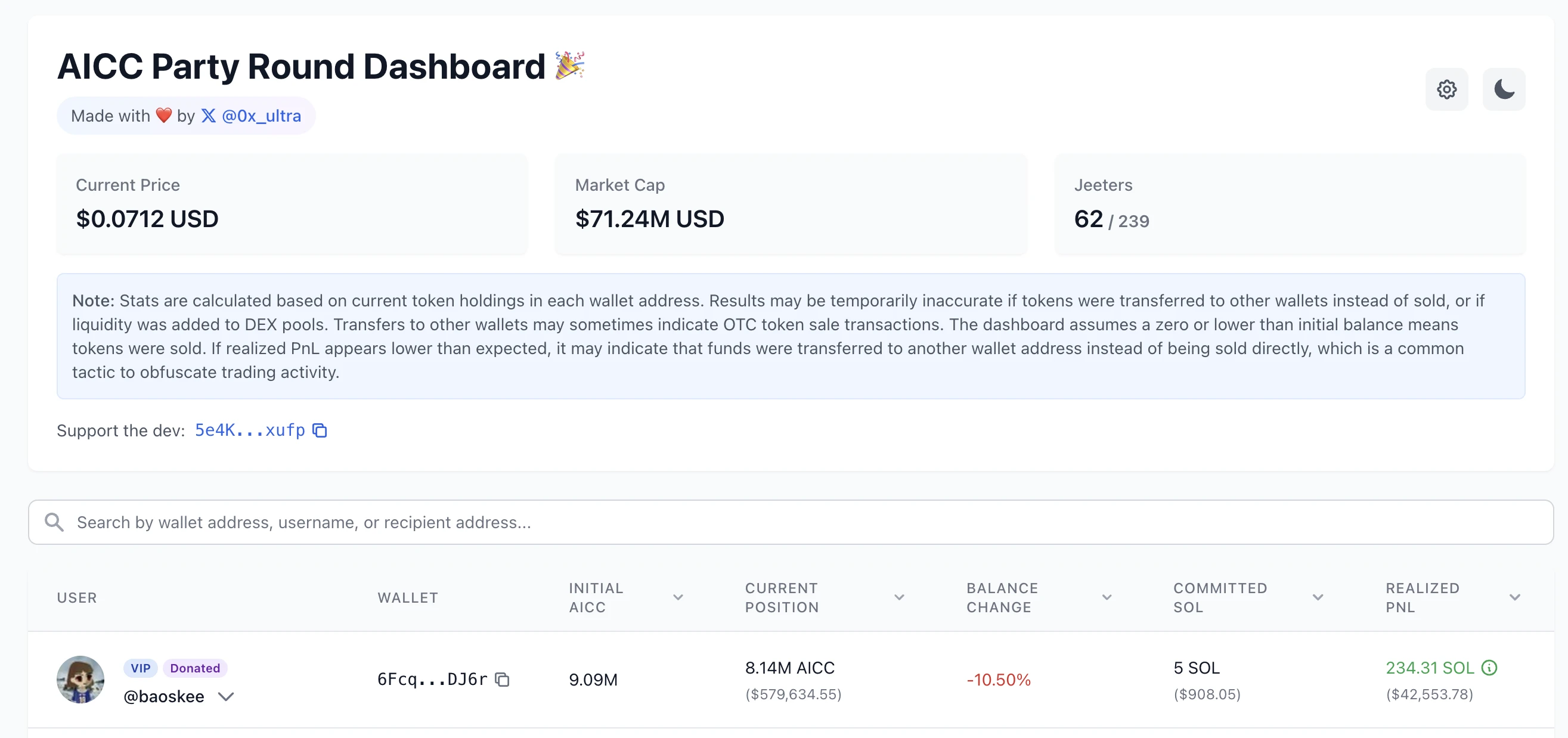 由此,AICC 的价格相较于募资时价格已实现超 1000 倍涨幅;另据 @0x_ultra 提供的数据平台信息,AICC 内盘前 5 大获利地址已合计获利超 131 万美元,这 5 个地址合计仅投入 4.5 枚 SOL,由此计算,已实现利润率约 7907 倍。此外,根据该数据面板统计,目前 AICC 获利出清的砸盘人数已高达 62 人,相较于 239 人的总数,占比高达 25.9%。