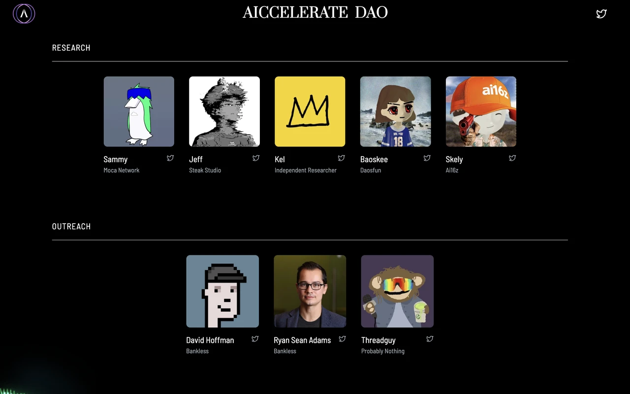 1 月 9 日,该项目公告提到,该 DAO 将专注于推动去中心化、开源的 AI 开发,并支持不同生态系统中具有高潜力的项目。此外,Aiccelerate 将自己定位为投资和开发并重的 DAO。其主要使命是推动其所谓的「AI Agent」领域的创新。该 DAO 旨在建立一个由多个框架中的顶尖开发者组成的协作社区,这些专家将为一系列旨在推进组织目标的代理和工具做出贡献,开发者顾问名单包括 ai16z 创始人 Shaw、Virtuals Protocol 核心贡献者 EtherMage、EigenLayer 开发者关系主管 Nader Dabit 以及 Story Protocol 联合创始人 Jason Zhao、Abstract 核心贡献者 Cygaar;投资者顾问包括 Mechanism Capital 的 Andrew Kang 和 Marc Weinstein、Coinbase Ventures 的 Justin Lee 以及 Delphi Digital 的 Anil Lulla 等人;研究员顾问则包括 daos.fun 创始人 Baoskee、ai16z Skely 等人在内;外联顾问则包括 Bankless DAO 创始人 David Hoffman 以及联创 Ryan Sean Adams 以及知名加密 KOL Threadguy。