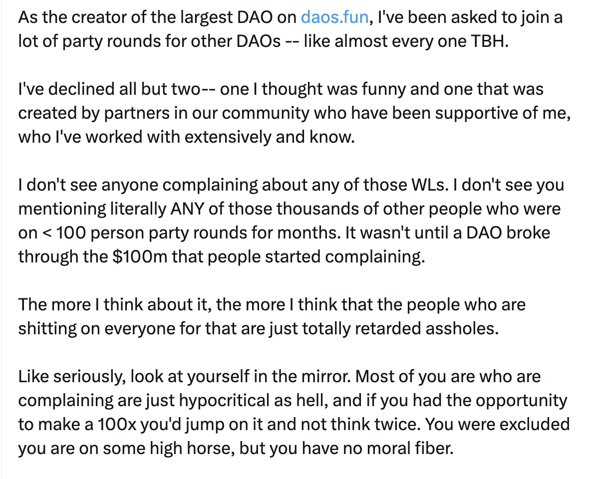 而后来或许是 ai16z DAO 社区以及其他加密社区的批评言辞过于激烈,Shaw 于今日凌晨 3 时左右又发布了一篇长文进行了回击,其大概意思为:作为 daos.fun 上最大的 DAO 组织创建者,Shaw 此前并未站台过 daos.fun 上其他项目,仅支持了 2 个项目——一个是认为很有趣(Odaily 星球日报注:此处应为此前募资 3 万余枚 SOL 的 Ai pool 项目 METAV),另一个是则由社区合作伙伴创造的 AICC。此外,其对 AICC 代币发布感到生气的原因在于整个项目感觉像是吸血鬼攻击,自己的名字和 DAO 品牌遭到利用。尽管如此,AICC 仍然是一场公平游戏,遵守了 daos.fun 的平台规则,只不过是由于白名单发放机制导致多数人并未受益,因此受到攻击。由此,他表示正在退出 Meme 币,因为这一文化是有毒的,其背后是一群假装前卫和反觉醒的 cancel 文化婴儿。最后,Shaw 表示,从现在开始,后续只会与人工智能人员和真正的 Builder 接触。目前,该条推文已被删除。