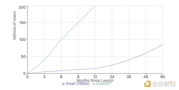 自电子邮件诞生以来,花了 35 年的时间才让 10 亿人拥有了电子邮件地址。而 ChatGPT 自 2022 年 11 月推出以来,目前的月活跃用户数(MAU)已接近 2 亿。可以参考以下的技术采用曲线: