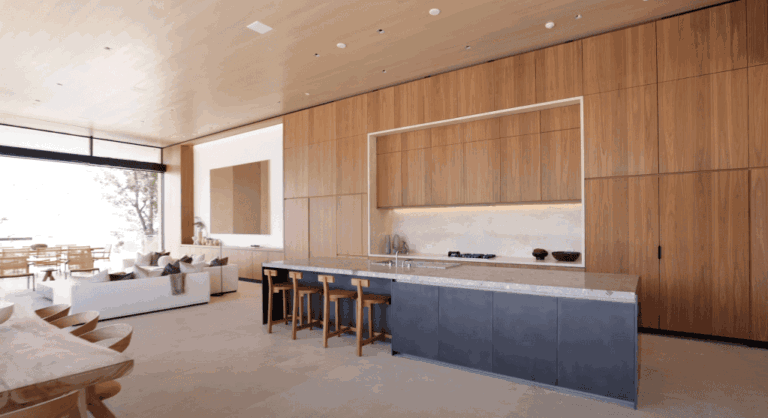 这座别墅的设计由备受尊敬的英国建筑师 John Pawson 操刀,以其标志性的极简主义美学著称。别墅的设计采用了「堆叠立方体」的结构,大面积的玻璃墙和简约的内部装潢配以宽敞的橡木家具,营造出一种现代而舒适的居住环境。