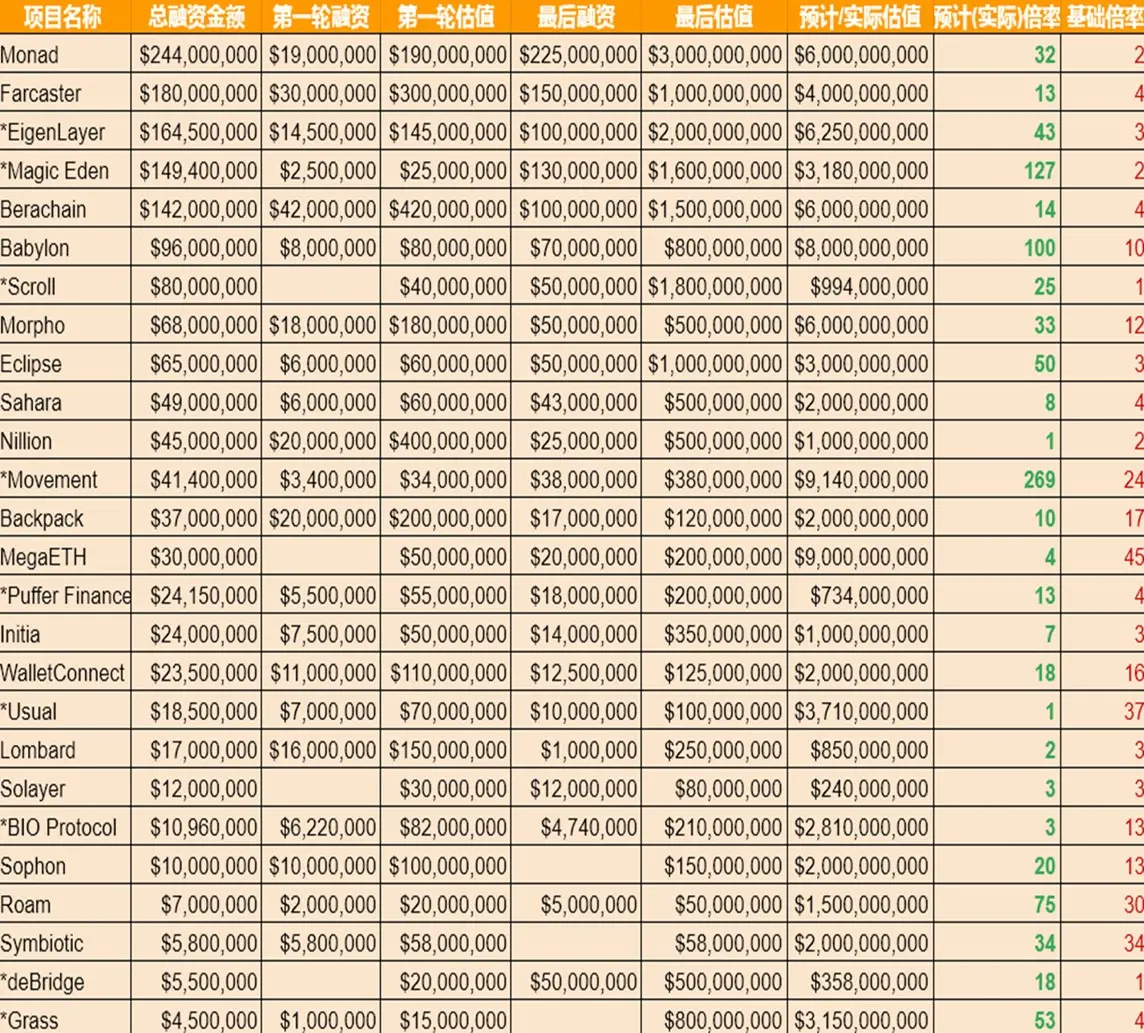 Monad获得最高融资以及8个头部机构的支持,预计将在Coinbase、Binance和Okex上线。Eigen上线后其TGE实际倍率达到43倍,代币价格维持优异。Q4上线Binance的$GRASS, $ME及$MOVE的表现优异其上线倍率目前高至100-50,而$USUAL的基础倍率及最后一轮至如今也有30倍。其中获得4至5个头部机构支持的Layer1表现不一,高性能叙事如Movement表现优异而零知识证明叙事的$SCR基础倍率表现欠佳,目前热度较高的叙事包括高性能公链Eclipse/Monad/MegaETH,旁氏流动性叙事的Berachain,链抽象的Initia, 人工智能及隐私的Sahara和Nillion及BTC叙事的Babylon和Lombard。