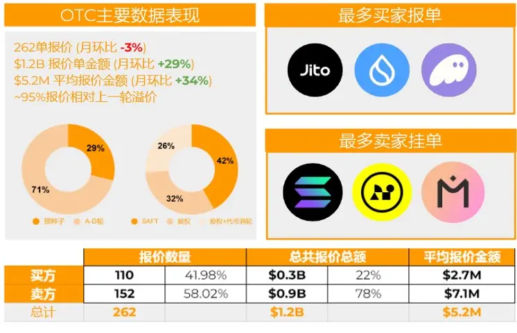 OTC市场报价金额总体上升并呈现以下特点:总交易量262单,环比下降3%; 总订单报价金额达到$1.2B,环比增长29%, 平均每笔交易额$5.2M,环比增长34%, 买方占比41.98%,卖方占比58.02%。