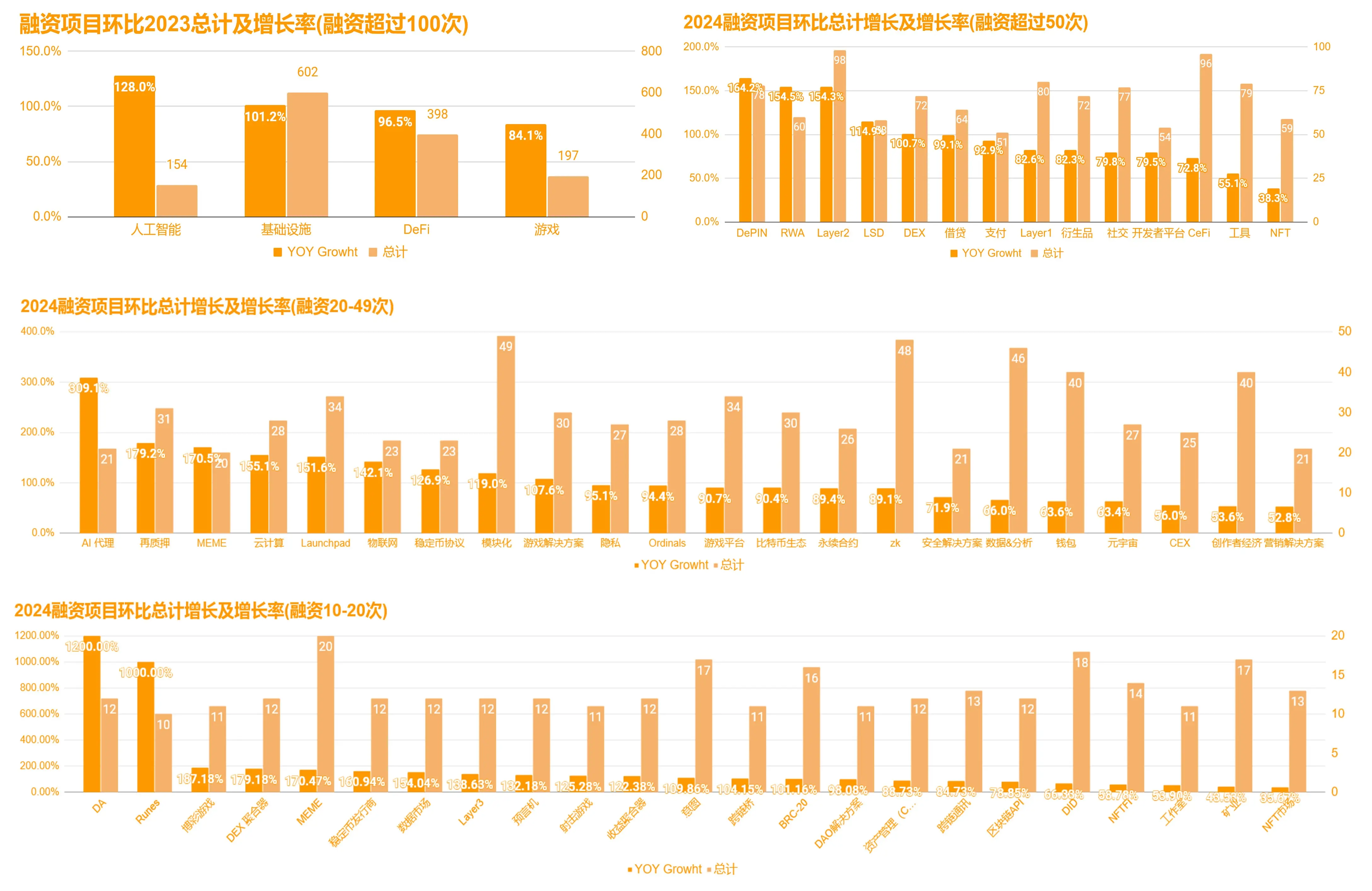 <50次投资:AI代理/再质押/MEME/云计算/发射平台/IoT/稳定币发行/DA/博彩预测游戏/DEX聚合/隐私/比特币生态(BRC20/符文/Ordinals)等增长率超过100%