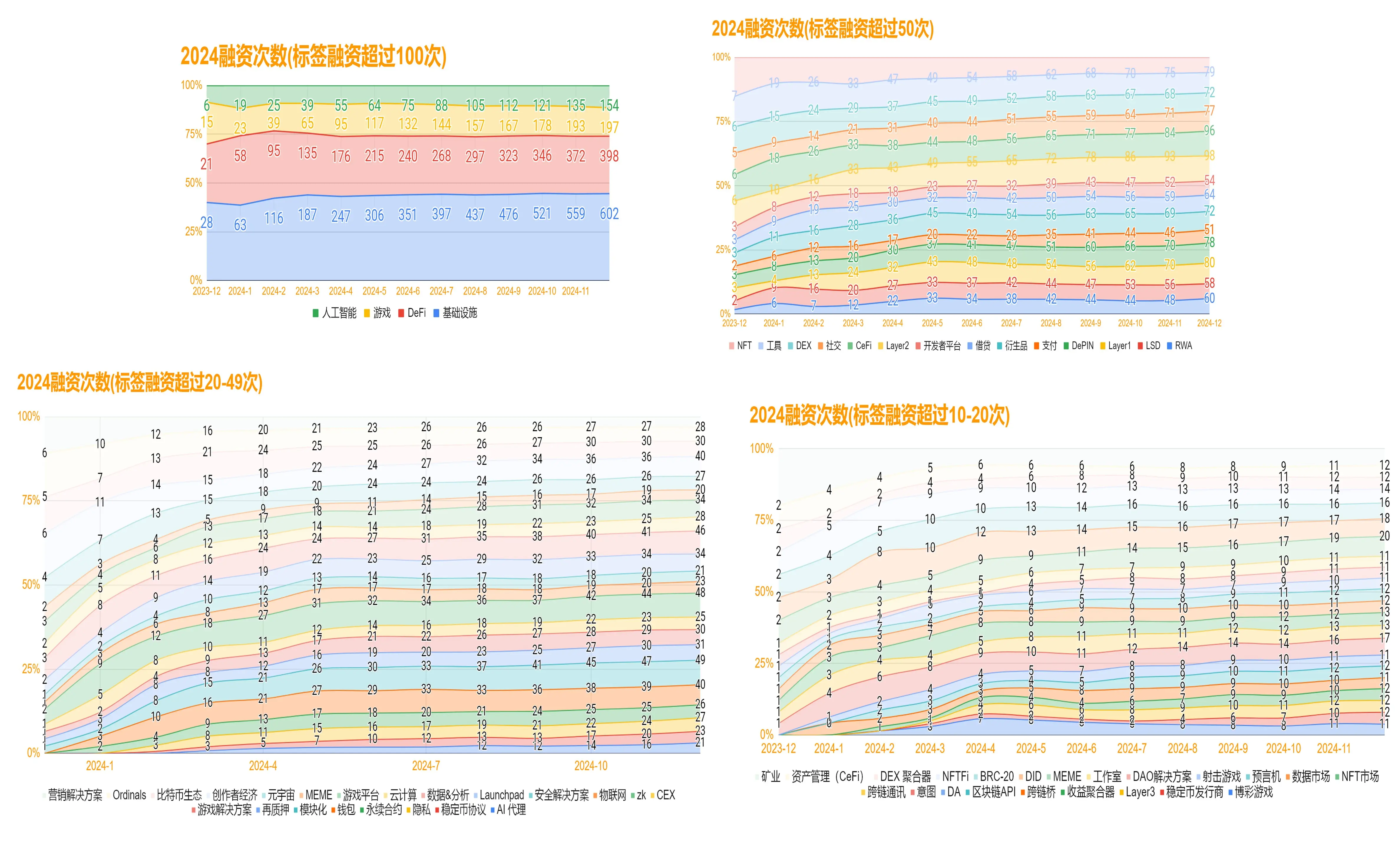 <50次投资:AI代理/稳定币协议/隐私/永续合约/钱包/模块化/再质押/游戏解决方案/ZK/CEX/博彩/Layer3/收益聚会/跨链桥/API/DA/意图增长明显, 营销方案/Ordinals/比特币生态/创作者经济/矿业/资产管理/NFT/BRC20/DID相关下滑明显