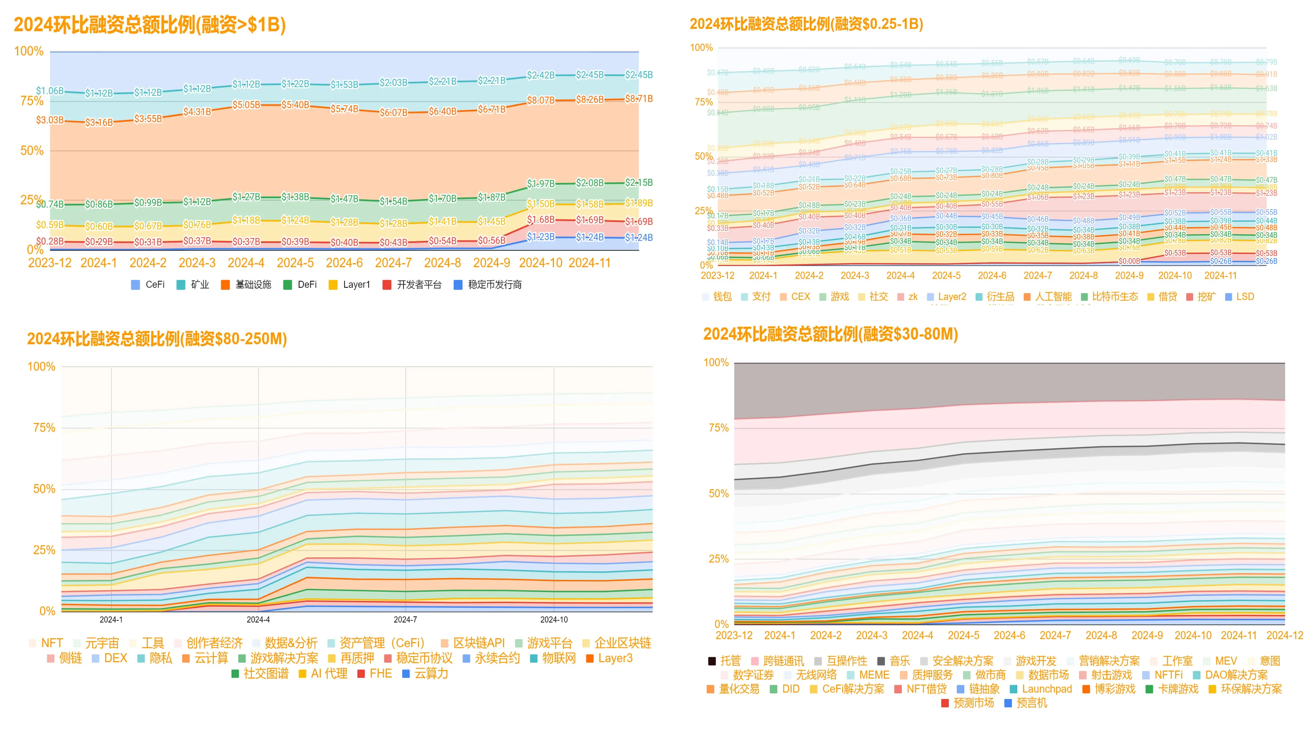 <$250M标签:云算力/FHE/AI代理/社交图谱/Layer3/预言机/预测市场/环保方案/卡牌游戏/博彩游戏/发射平台/链抽象/NFT借贷/CeFi/DID从Q1开始明显占比上升, 再质押/游戏解决方案/隐私/DEX/质押服务等全年稳速占比上升, NFT/元宇宙/工具/托管/跨链/互操作/音乐/CeFI资产管理金额占比下滑明显