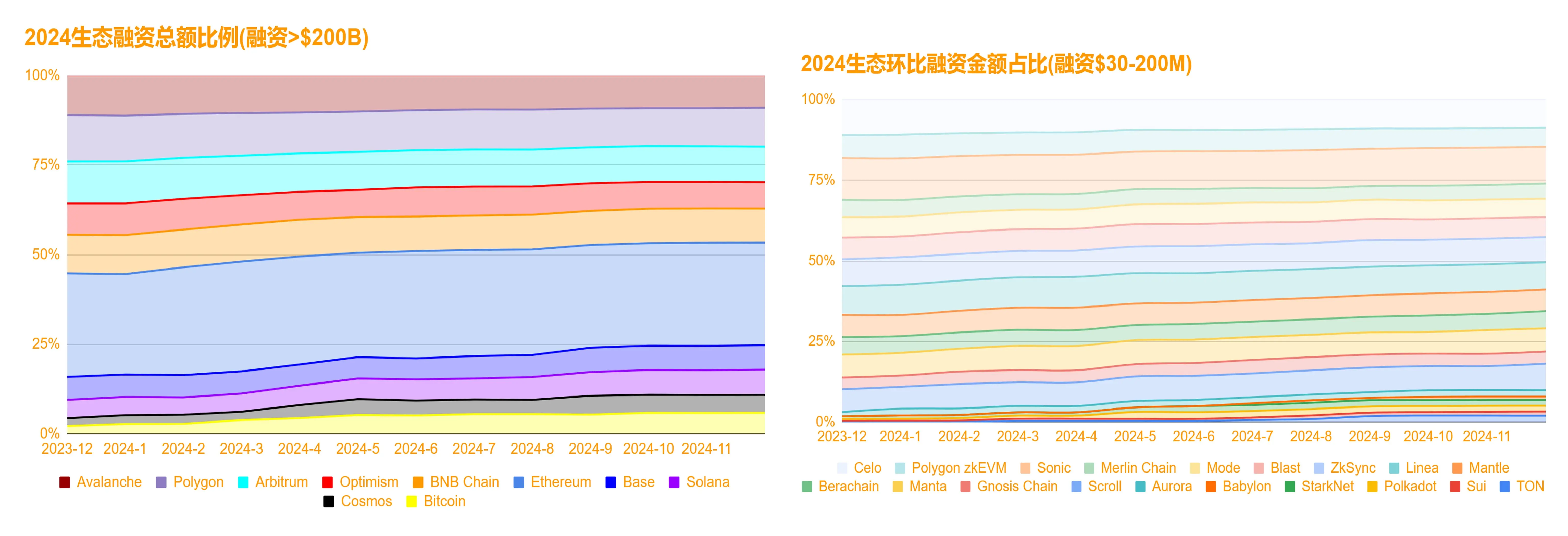 $30-200M融资总额:TON/SUI/DOT/Starknet/Babylon/Aurora全年增长明显, 其余占比变化不大