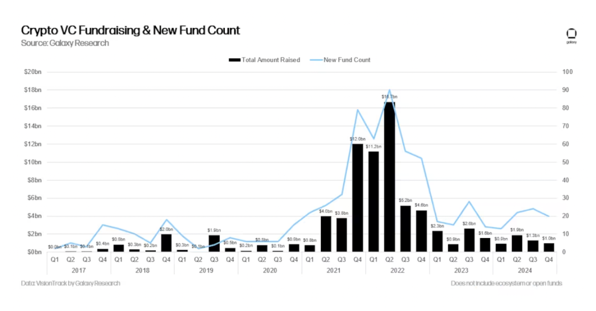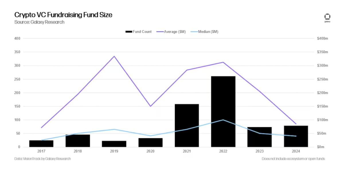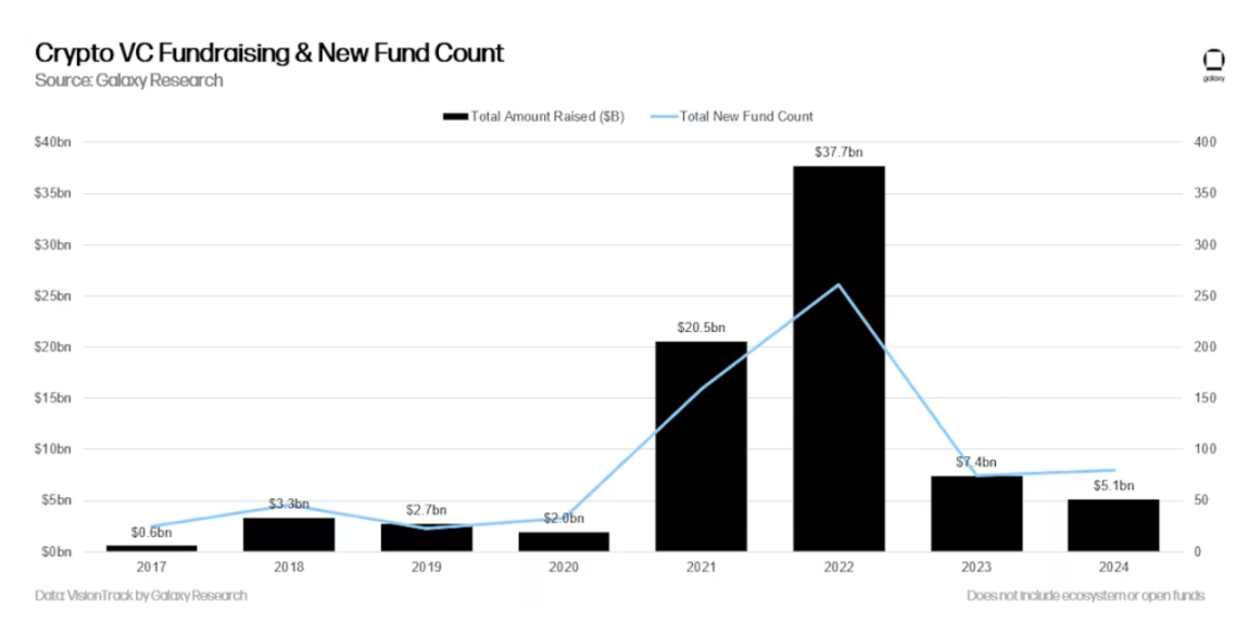 2024 年是自 2020 年以来加密货币风险投资募资最疲软的一年,79 只新基金共募资 51 亿美元,远低于 2021 - 2022 年的狂热水平。