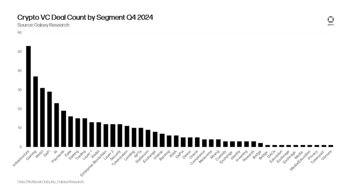 将上述较大类别进一步细分后,构建加密基础设施的项目和公司在所有细分领域中的交易数量最多(53 笔)。游戏和与 Web3 相关的加密货币公司紧随其后,2024 年第四季度分别完成 37 笔和 31 笔交易,与 2024 年第三季度的排名几乎相同。