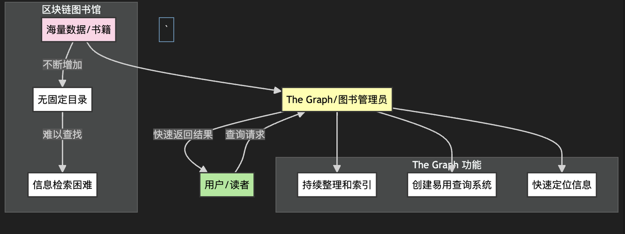 当你需要某个特定信息时,你只需要告诉 The Graph 你想要什么,它就会快速地为你找到相关的书籍和"页码"(具体的区块链数据)。