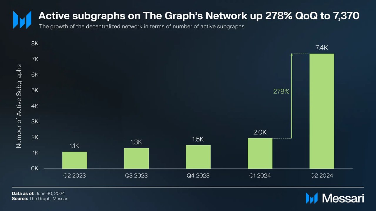 根据 Messari 数据,截至 2024 年第二季度末,已有 7,370 个子图发布到去中心化网络,较 2024 年第一季度末的 1,952 个增长了 278%。