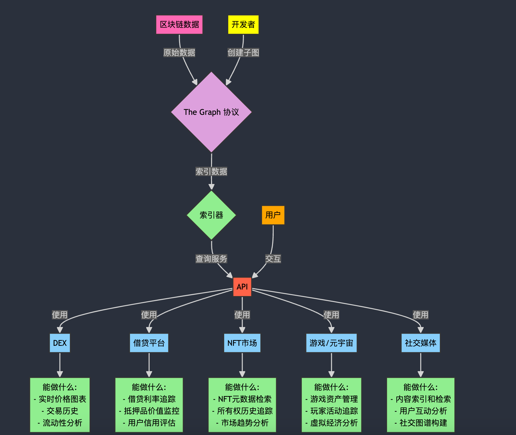 开发者和项目们不需要自己建立复杂的数据索引系统,用户可以更快速地获取他们需要的区块链信息。使得构建复杂的去中心化应用(DApps)在数据层面显得变得更加容易。