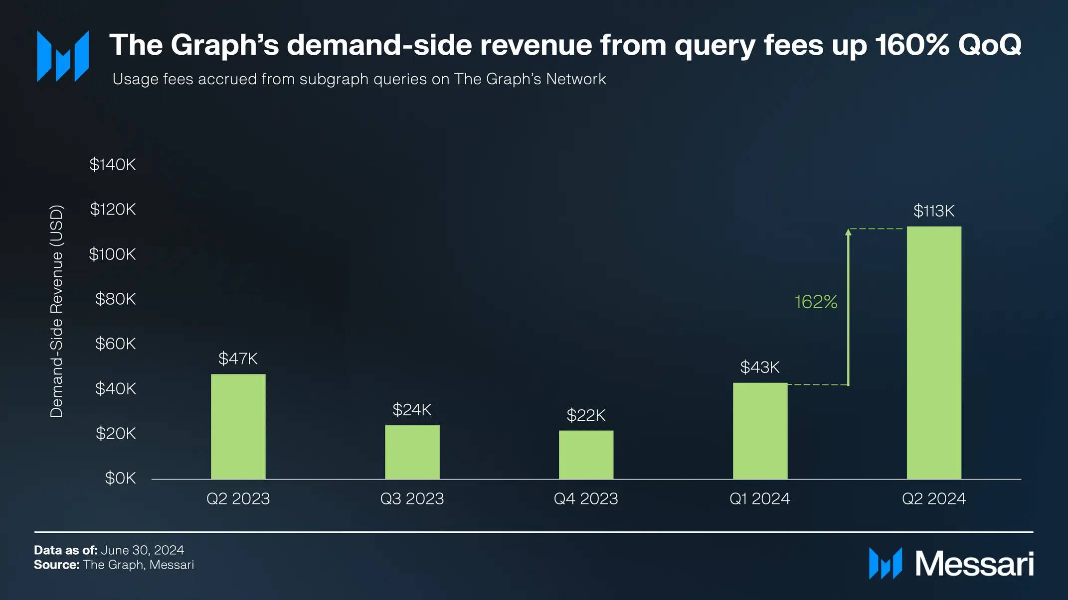 Messari 的另一则数据报告则显示,截止去年 Q2 ,The Graph 的查询费总收入以美元计算环比增长 160%,达到历史最高水平 113,000 美元;