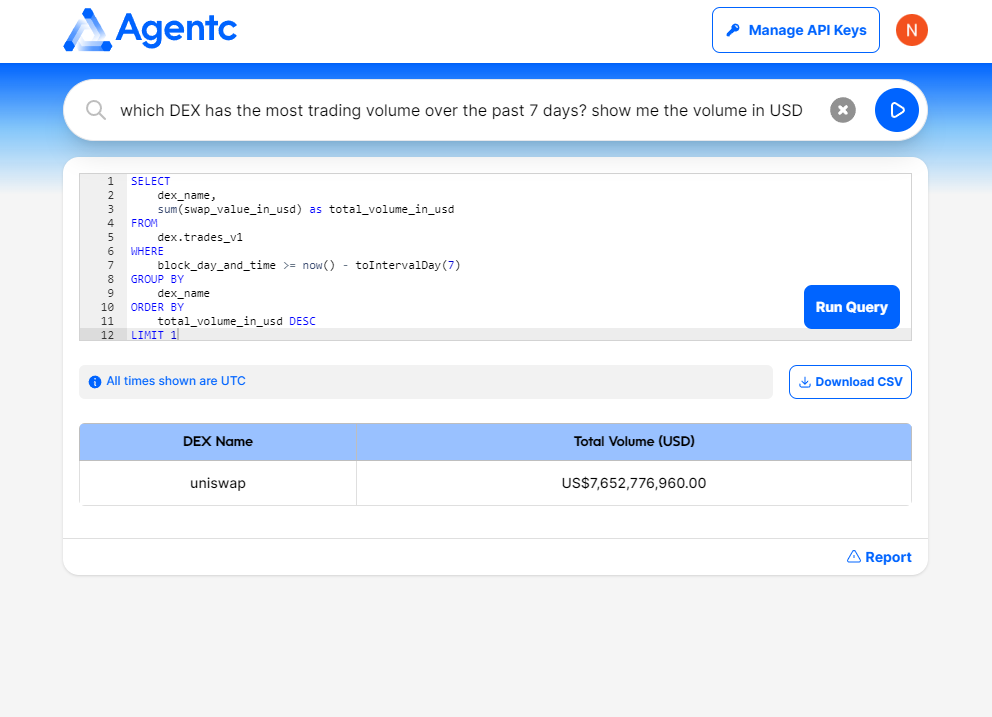 而更为直观的 AI 代理产品上,项目也在构建类似于加密版 ChatGPT 的工具,建立在 The Graph 索引的去中心化交易所的数据之上。例如你可以直接问哪个DEX交过去七天内的交易量最高,利用索引查询返回结果。