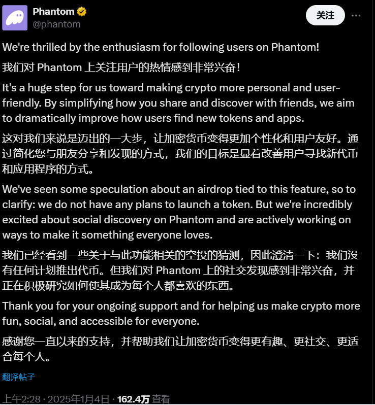 Phantom 的 CEO Brandon Millman 在 2022 年的采访中曾明确表示,Phantom 的核心目标是提供一流的用户体验,而非通过发币获利。他强调,Phantom 的定位是「消费者金融平台」,而非单纯的加密项目,Phantom 更倾向于通过传统金融模式实现长期发展,而非依赖代币经济。在半个月前,Phantom 更发推表示「没有任何计划推出代币」。