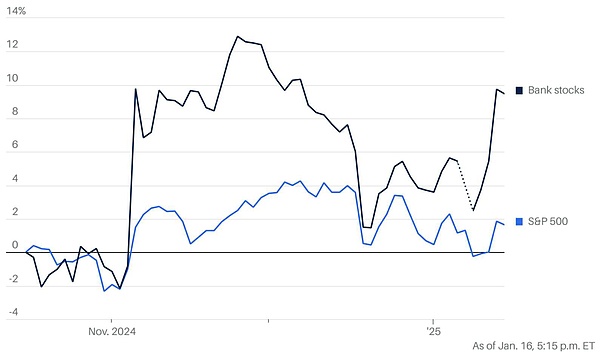 与此同时,银行业也面临一些风险。经济学家预计,今年的降息幅度将低于此前人们的预期,与此同时,目前还不清楚特朗普会如何放松监管。