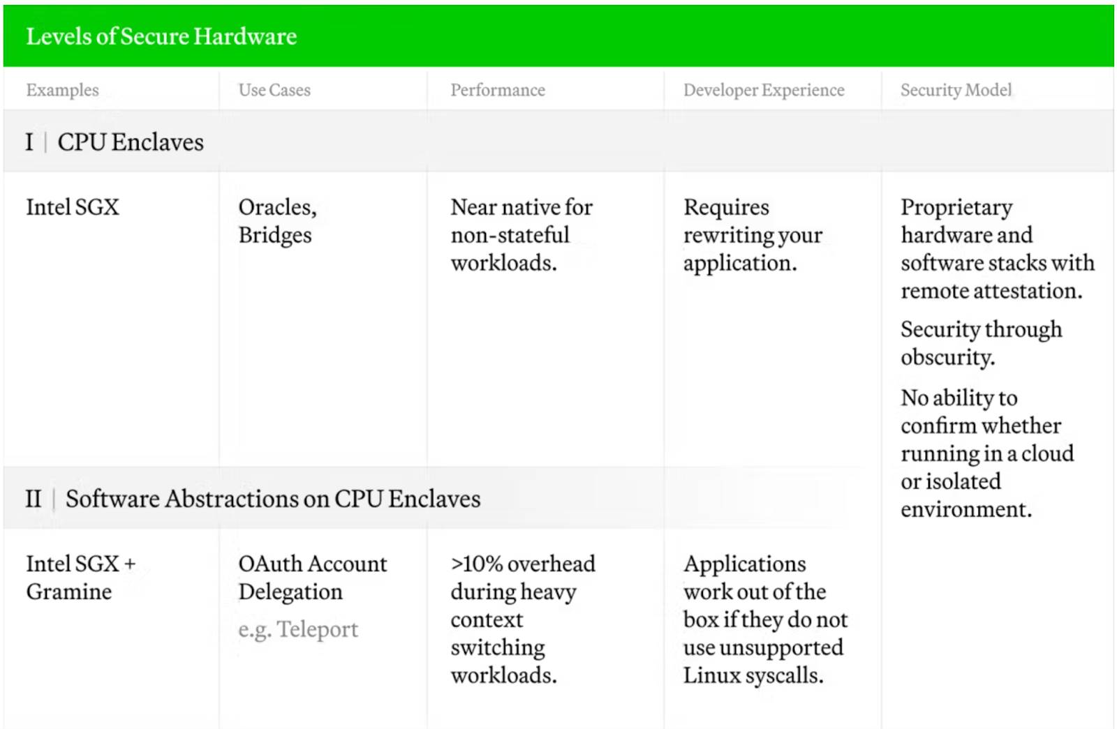 Phala经历多轮牛熊,在代币经济模型上,暂时还维持着面向英特尔 SGX的商业模式。从Paradigm「The 5 Levels of Secure Hardware」一文可知,安全硬件有5个级别,其中第二级别是指:性能稍差,但开发者体验更好,允许使用更具表现力的应用程序,安全性无改进。 英特尔 SGX在这一级别中,是专为TEE APP服务的。如本文开头提及的,电脑和手机中指纹的录入比对以及面部识别等敏感的本地存储的数据会使用英特尔 SGX,这种上一代的TEE是具体为APP服务的。